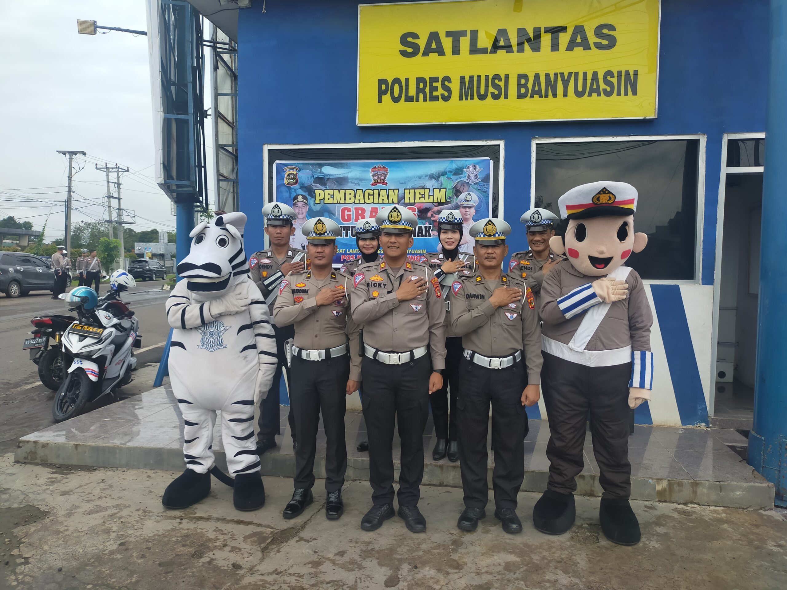 yang di komando kasat lantas Polres Musi Banyuasin AKP Ricky Mozam S.H.,M.H melakukan pembagian helm Gratis bersama jajarannya kepada Pengendara sepeda motor yang membonceng anak tidak mengunakan Helm.
