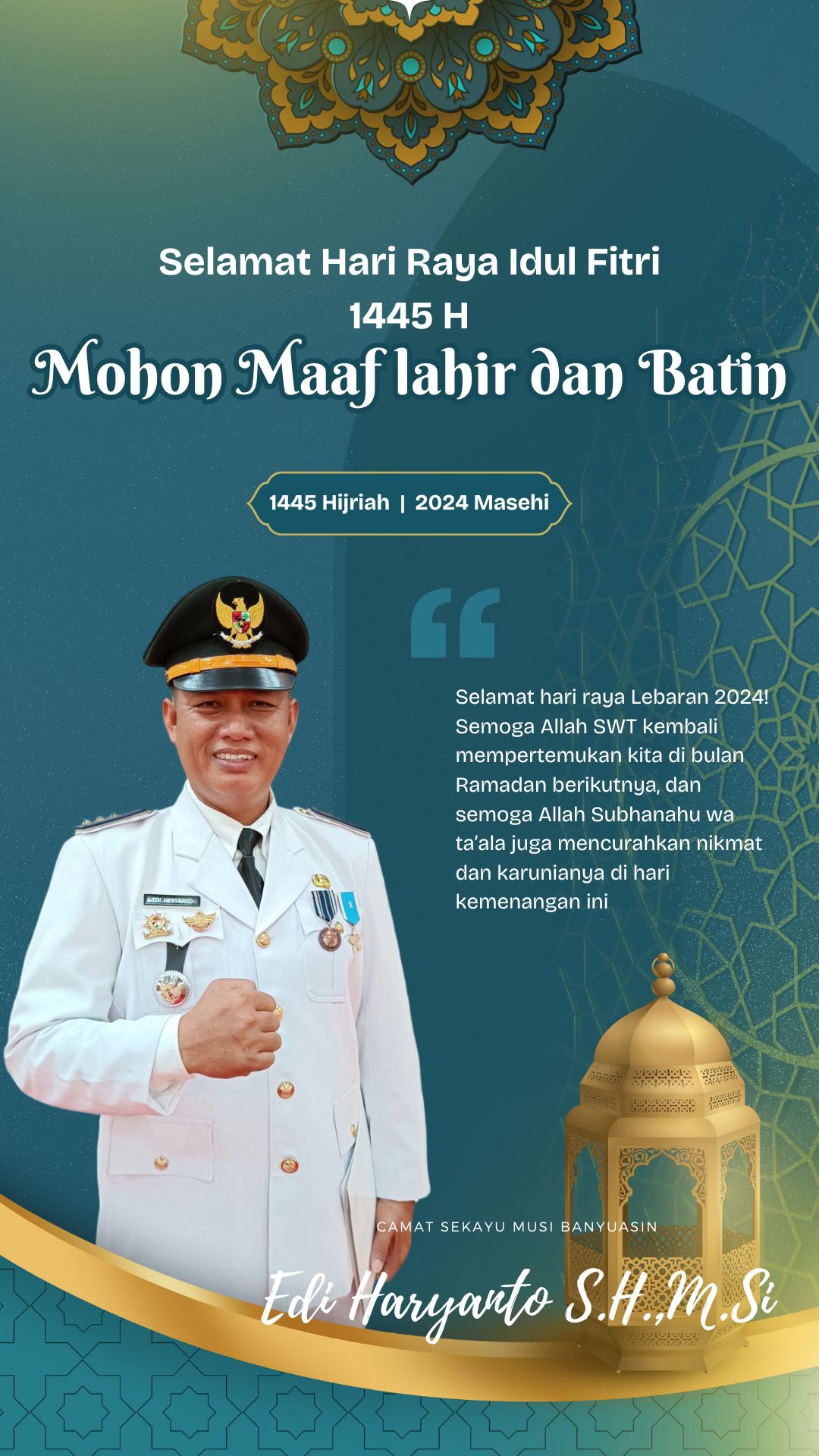 Ucapan Hari Raya Idul Fitri 1445 H Camat Sekayu Edi Haryanto SH Msi AQJnews.com April 5, 2024 Baca Juga : Simpang Sari optimis, Luci Safar Menang Pilkada Muba 2024.