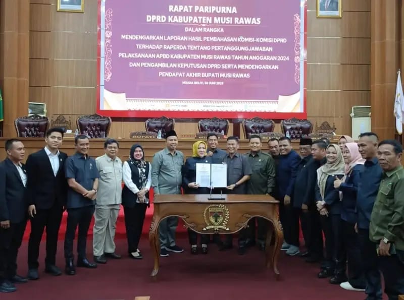 Persetujuan itu disampaikan anggota DPRD Musi Rawas melalui juru bicara masing-masing komisi dalam rapat paripurna DPRD Kabupaten Mura dengan agenda Mendengarkan Laporan Hasil Pembahasan Komisi-Komisi DPRD Terhadap Raperda tentang Pertanggungjawaban Pelaksanaan APBD Kabupaten Musi Rawas Tahun Anggaran 2024 dan Pengambilan Keputusan DPRD serta Mendengarkan Pendapat Akhir Bupati Musi Rawas, Senin 30 Juni 2025.