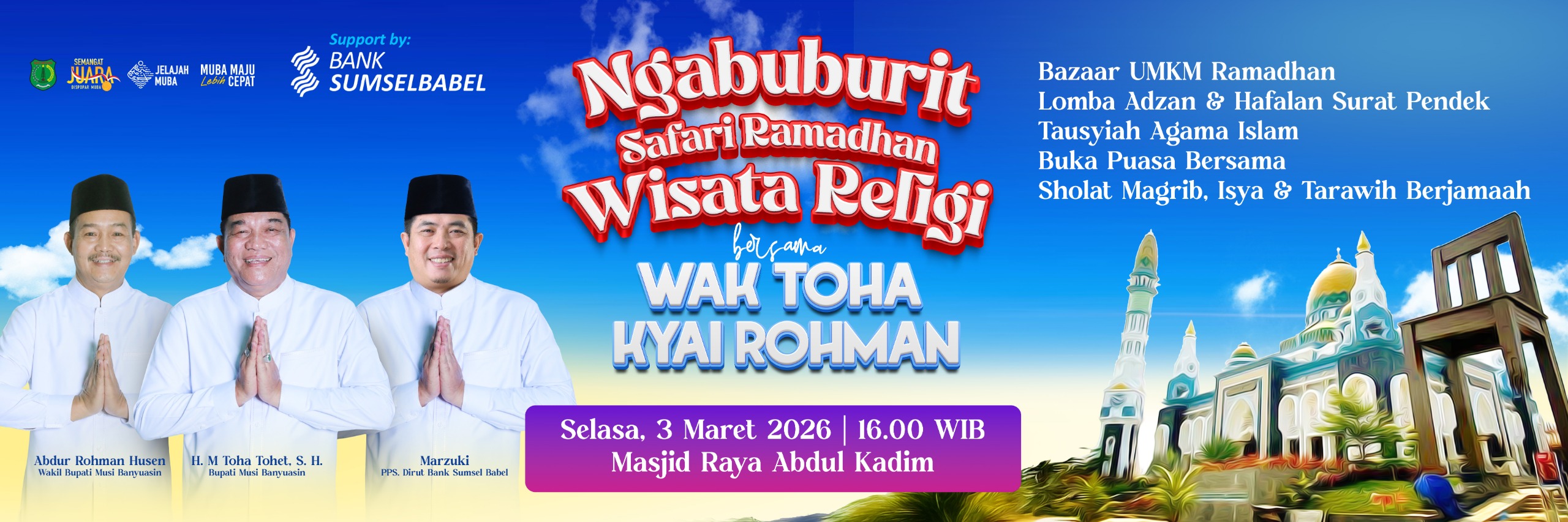 MUBA, SUMSEL – Mengisi kemuliaan bulan suci Ramadhan 1447 H, Pemerintah Kabupaten Musi Banyuasin (Muba) menjadwalkan kegiatan “Ngabuburit Safari Ramadhan & Wisata Religi”. Acara yang sarat akan syiar Islam ini akan dipusatkan di Masjid Abdul Kadim, Desa Epil, pada Selasa, 3 Maret 2026.